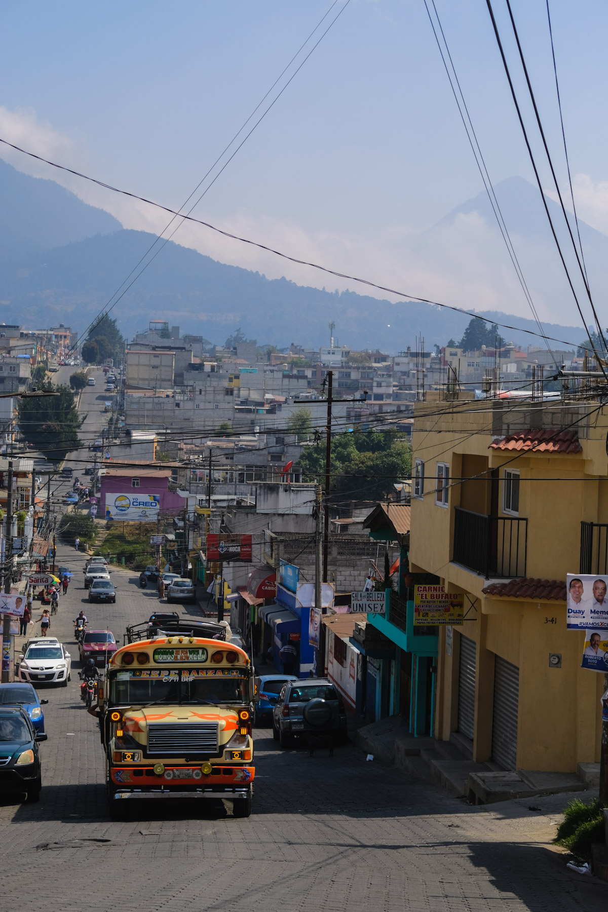 Finally made it to the city! This bus you see here is a Chicken Bus and is the main source of public transport in Guatemala. They are old American school buses, each beautifully and uniquely painted. I have yet to ride one yet but I would really like to. You can also see Santa Maria in the backdrop.