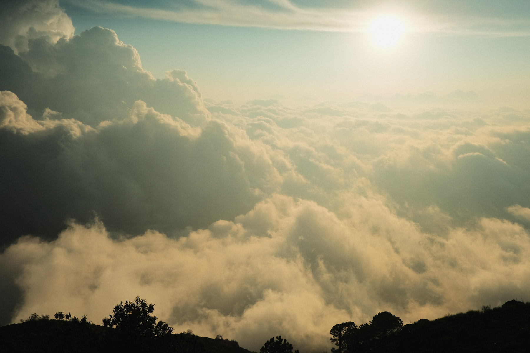 The sun peaking its head just above the clouds. That is Volcano Santo Tomas on the right side.