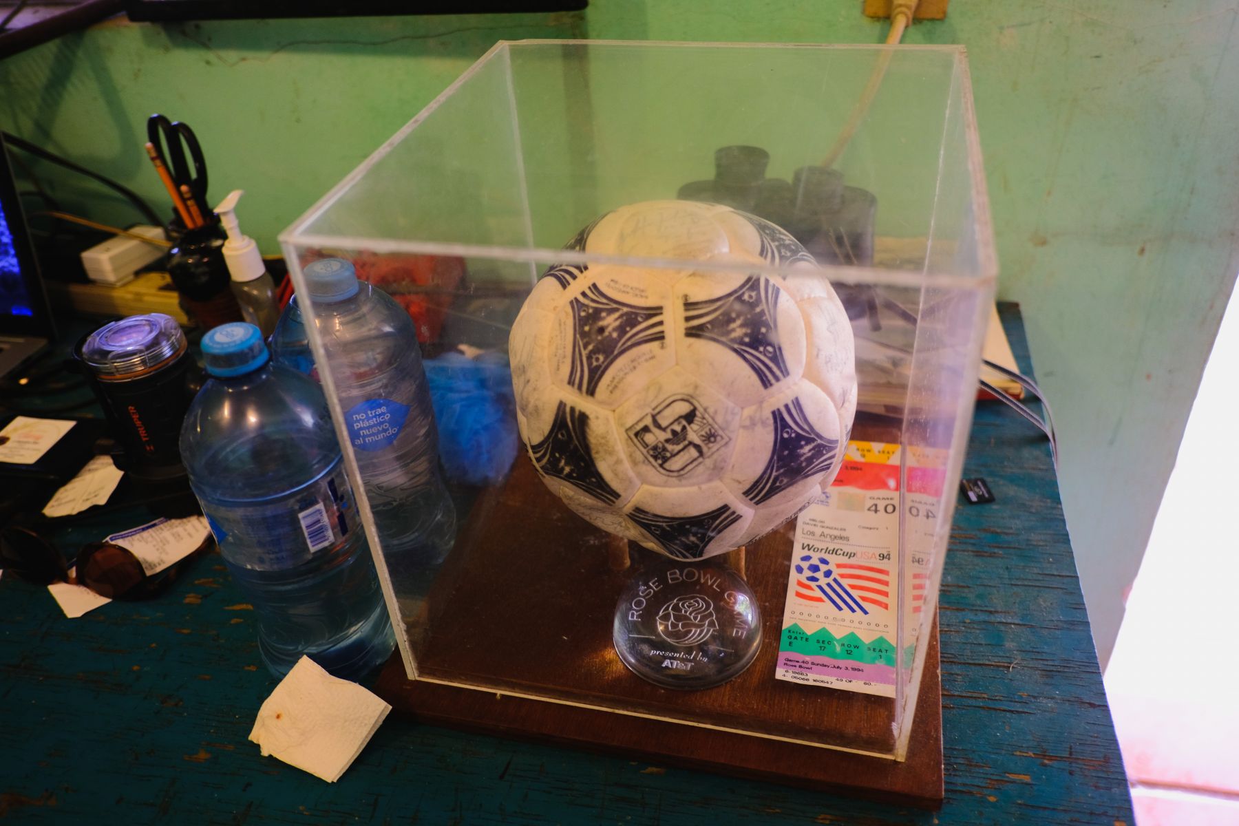 He was from New York but lived for a while in California. He ran a catering company that had the Rose Bowl as a client, which allowed him to be the caterer for the 1994 FIFA World Cup. This ball here was signed by Pele, famous celebrities, and lots of other interesting people.