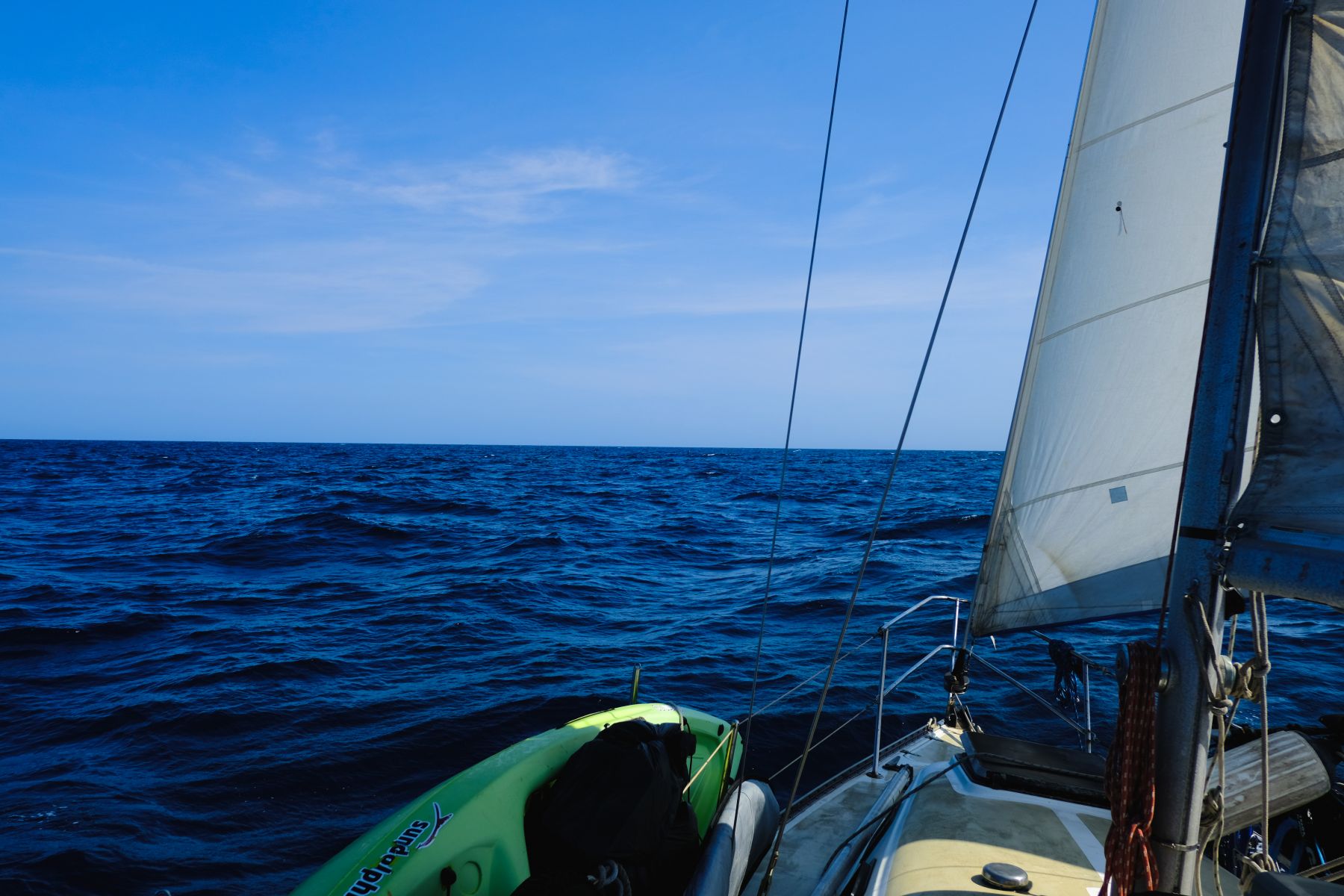 After leaving the channel, we were able to raise the sail since the wind was good. Now we were sailing! Sailing interested me a lot in the way biking does. It is freedom of the ocean as a bike is freedom of the sea. Using the wind to move is really powerful.