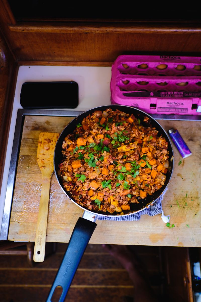 Cooking while moving was pretty tricky. The rocking of the waves would demand nearly constant attention on the pots and pans.