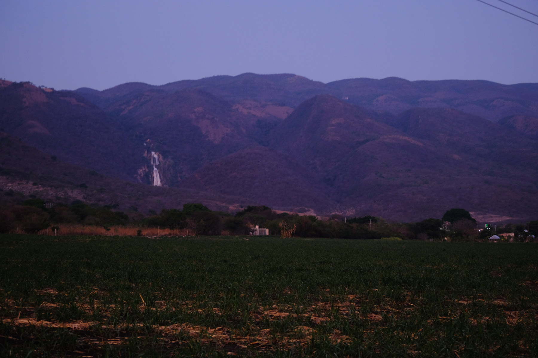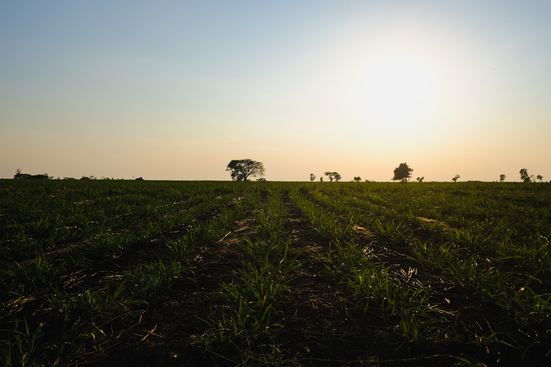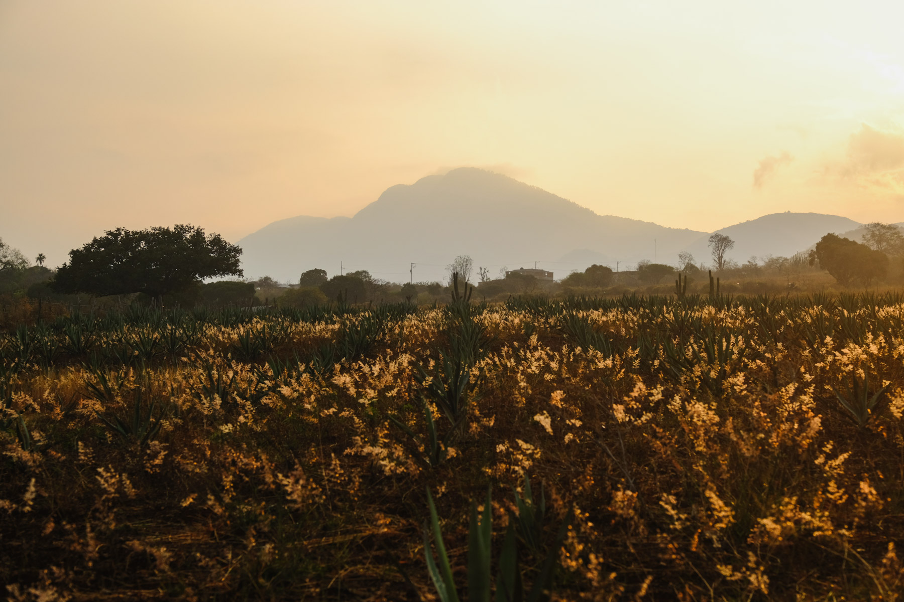 Sun setting behind some agave fields.
