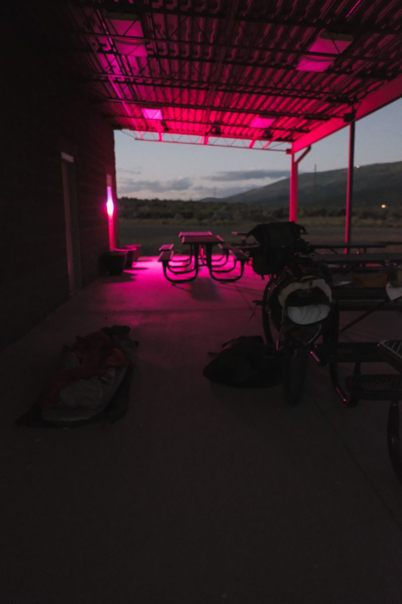I would only make it a little bit further as I hopped back on a main ride and right back into strong headwinds, nearly 20mph winds. I came across this RV park that was completely empty and had no one working. The bathrooms were very clean and they had hot showers so I decided to stop here and sleep under the patio.