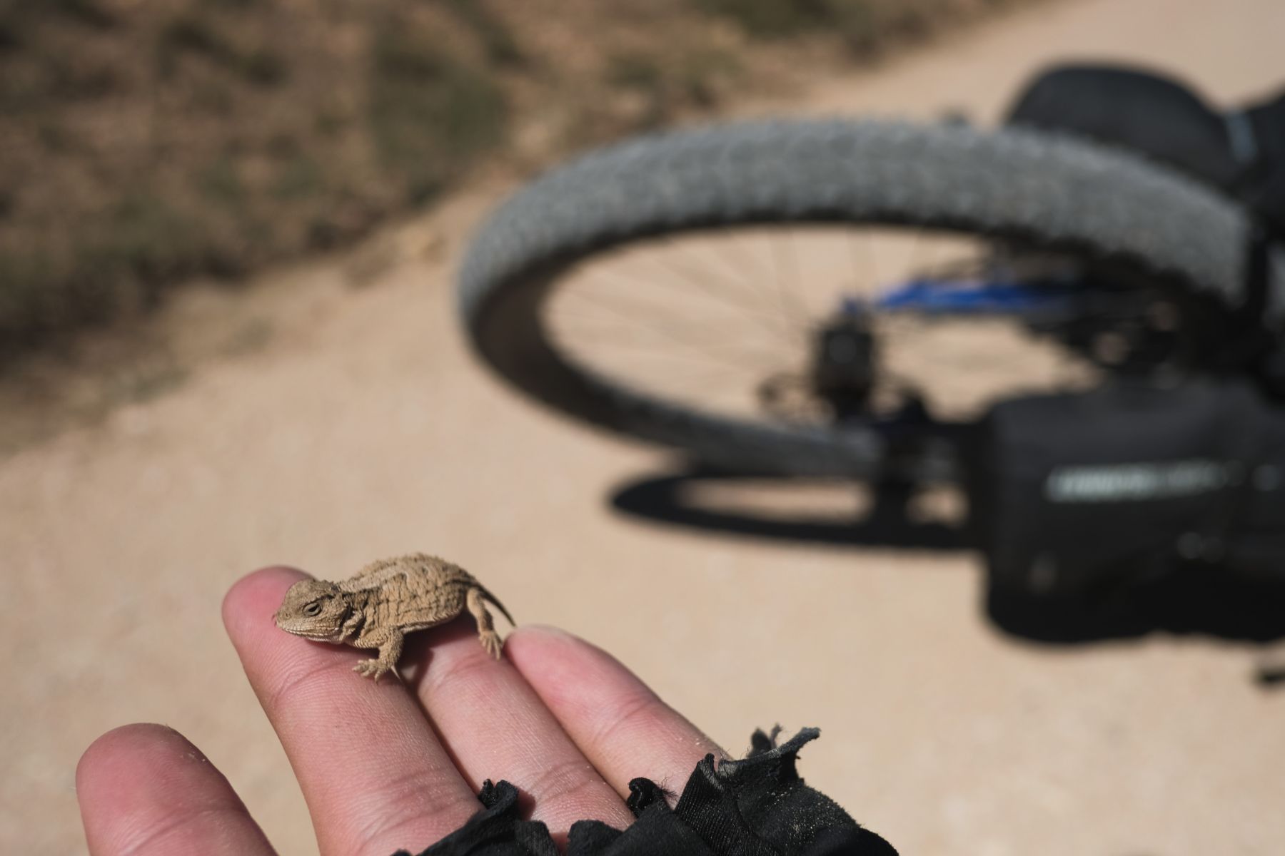 I rode some lovely gravel out of the park through some National Forest terrain. I saw this cute little fat lizard and stopped to check him out. He was a baby horned lizard and was very friendly.