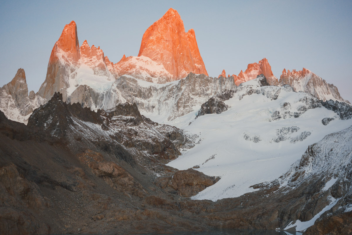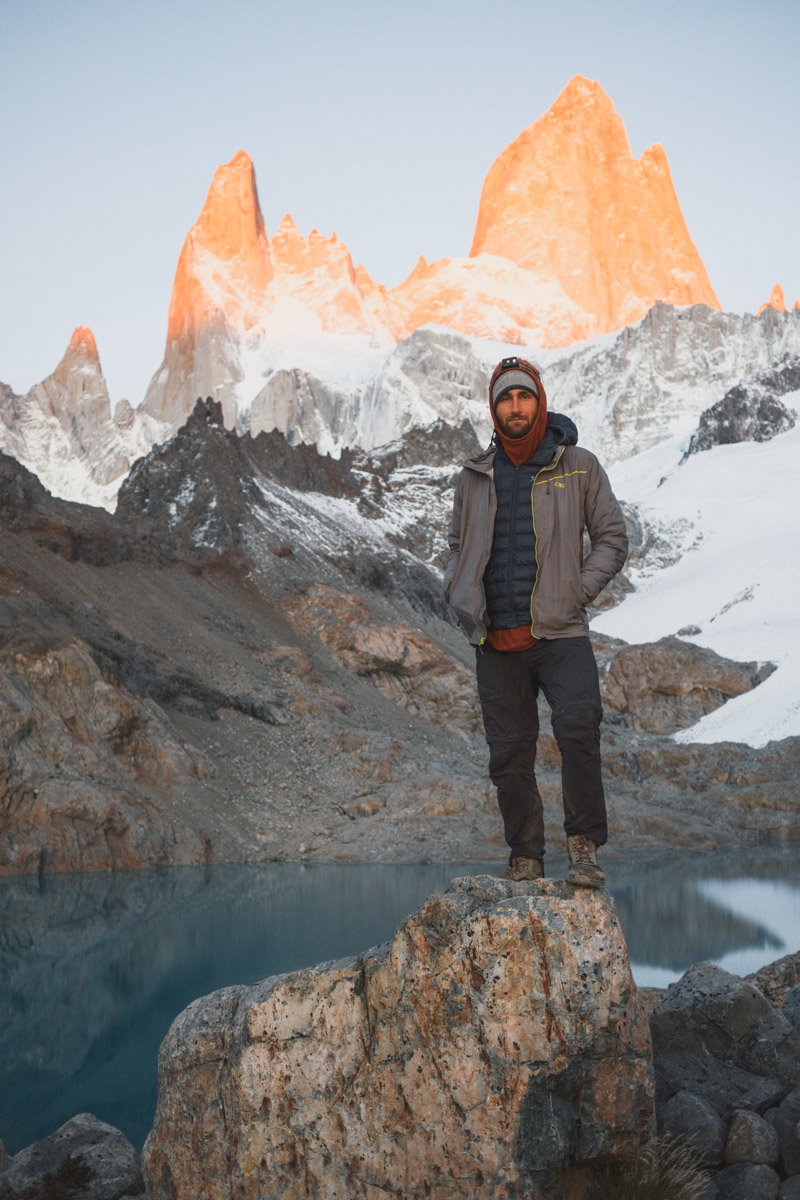 The moment came for the highlight, alpenglow. A fleeting moment when the sunlight hits the tips of the mountain and gives it a stunning red glow. I rarely take photos of myself, but I couldn’t resist setting up my camera to take some self-portraits with the incredible backdrop. I’m very happy with how it came out.