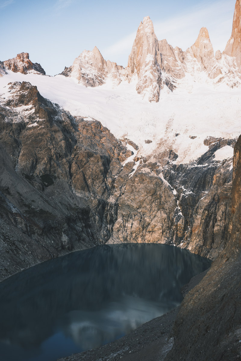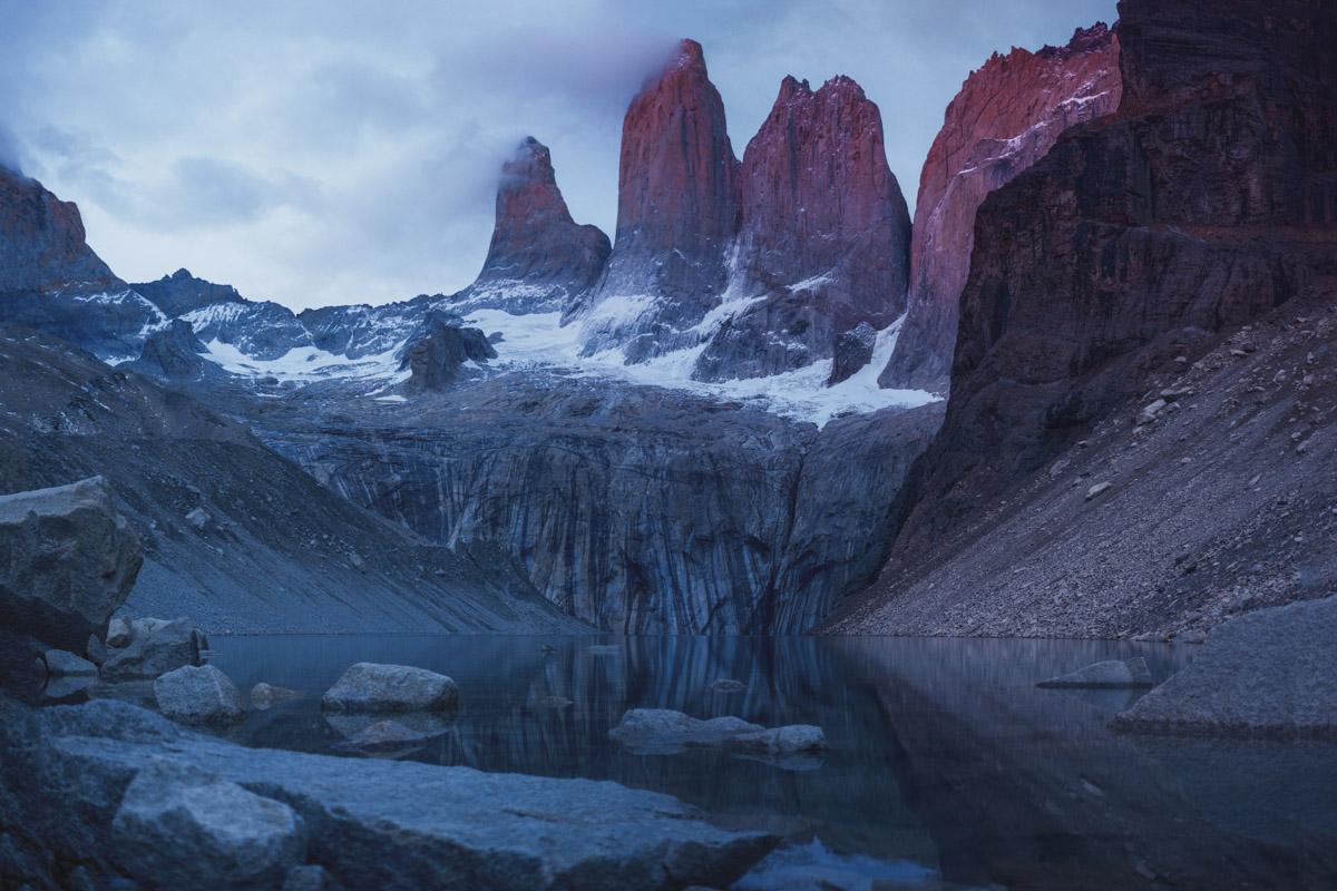 Another 3 a.m. wake-up call and another 3-hour hike in the dark to the base. Unfortunately, there were a few clouds in the sky so I didn’t ge the dramatic alpenglow as Fitz Roy, but it was still a breathtaking view, and would be the only view for the day as clouds would cover the peaks for the rest of the day.